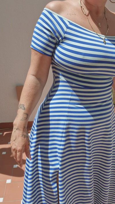 Bardot Dress Midi A-Line (short sleeves) in Blue/Mint Stripe
