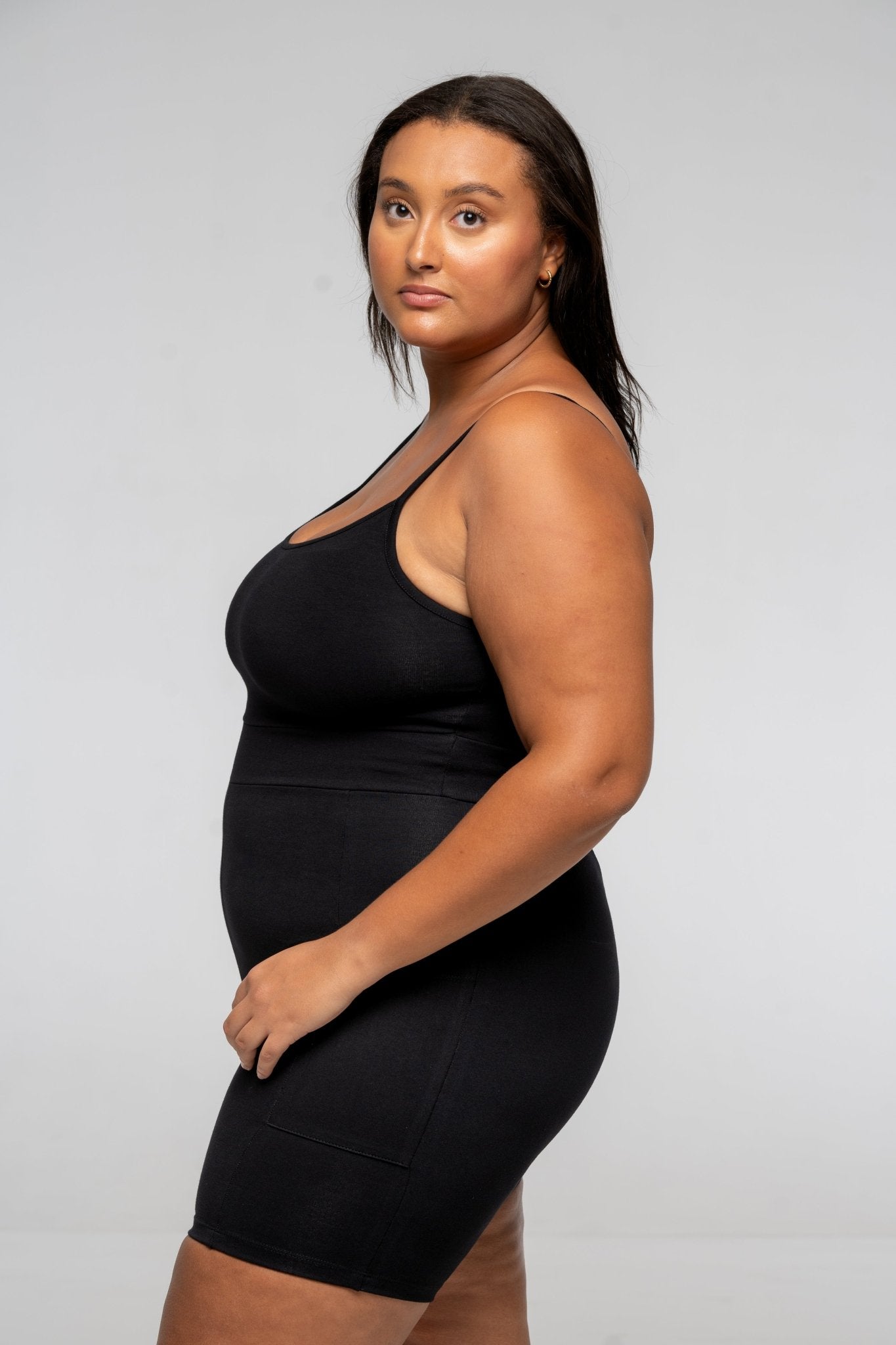 The fabric used for all Manners London pieces is super thick heavyweight stretch cotton made of 90% cotton 10% elastane. It has a huge stretch allowance without going see-through at all! On arrival items will look small but don't be scared, it's just the nature of the fabric and what makes it so deliciously smoothing and shaping and magical!