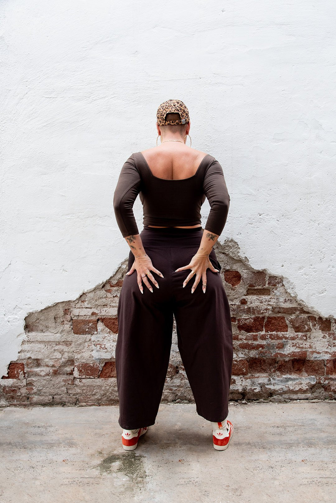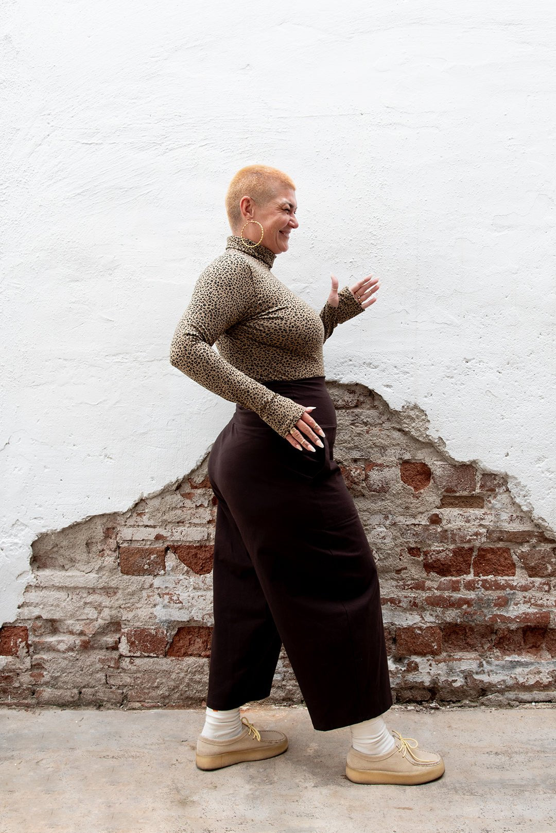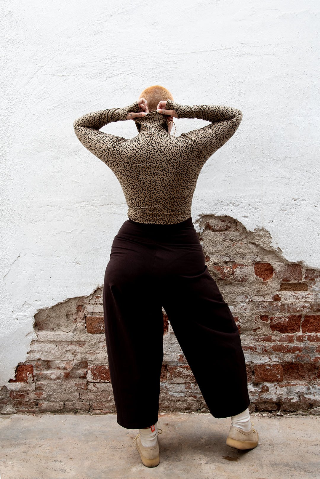 Puffy, stretchy, deep pockety, double waist bandy. THE BARREL trousers of the season. The wide curved cut, the length, the COMFORT. Perfect paired with the leopard turtle neck or the new square neck in cafe for matchy or the oversized T’s if you're more more of a baggy all over person.