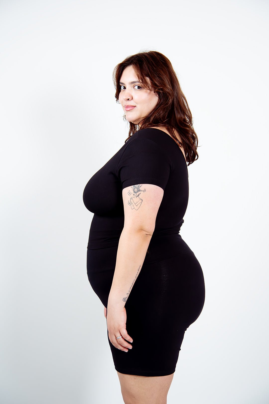 The fabric used for all Manners London pieces is super thick heavyweight stretch cotton made of 90% cotton 10% elastane. It has a huge stretch allowance without going see-through at all! On arrival items will look small but don't be scared, it's just the nature of the fabric and what makes it so deliciously smoothing and shaping and magical!