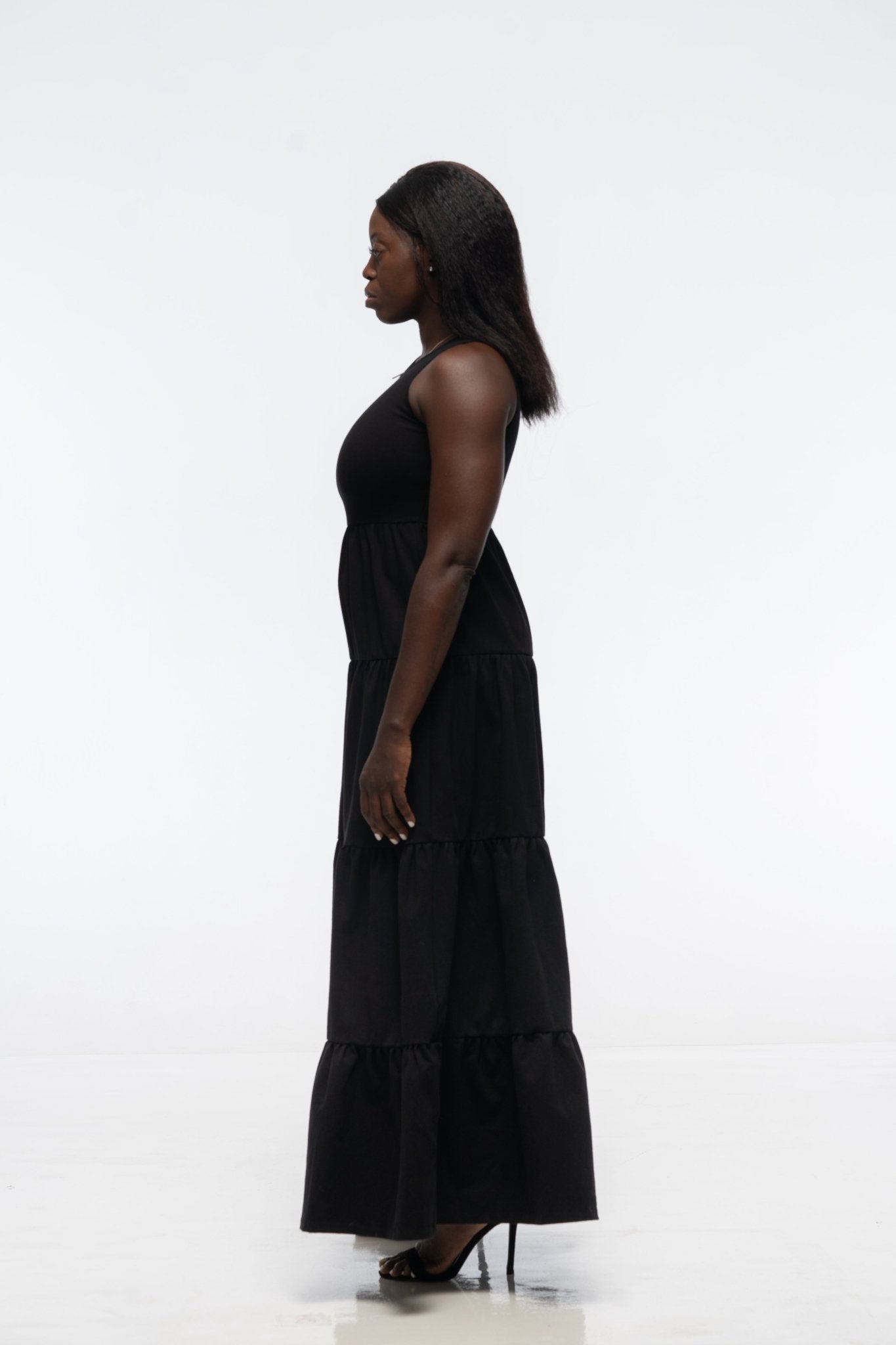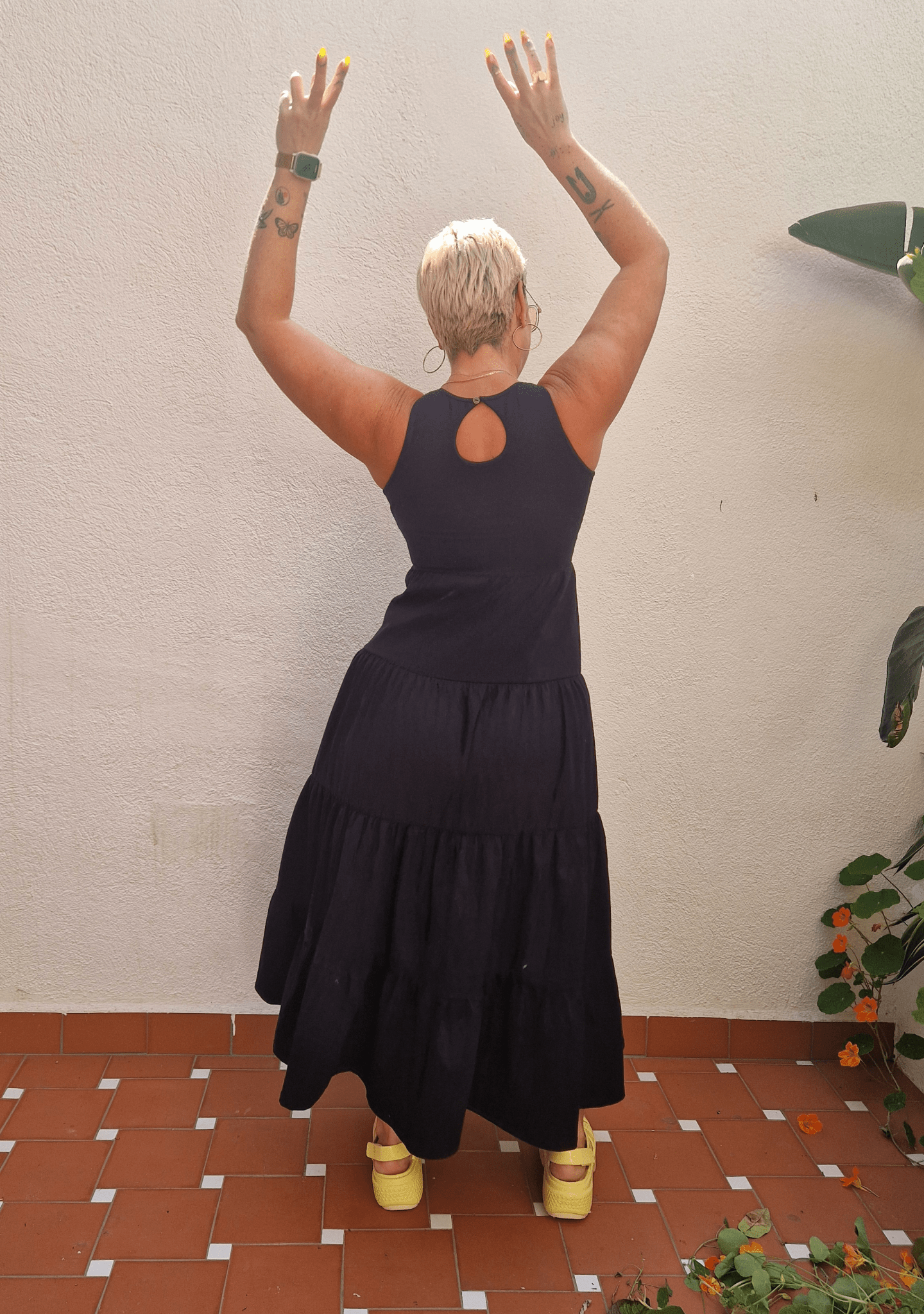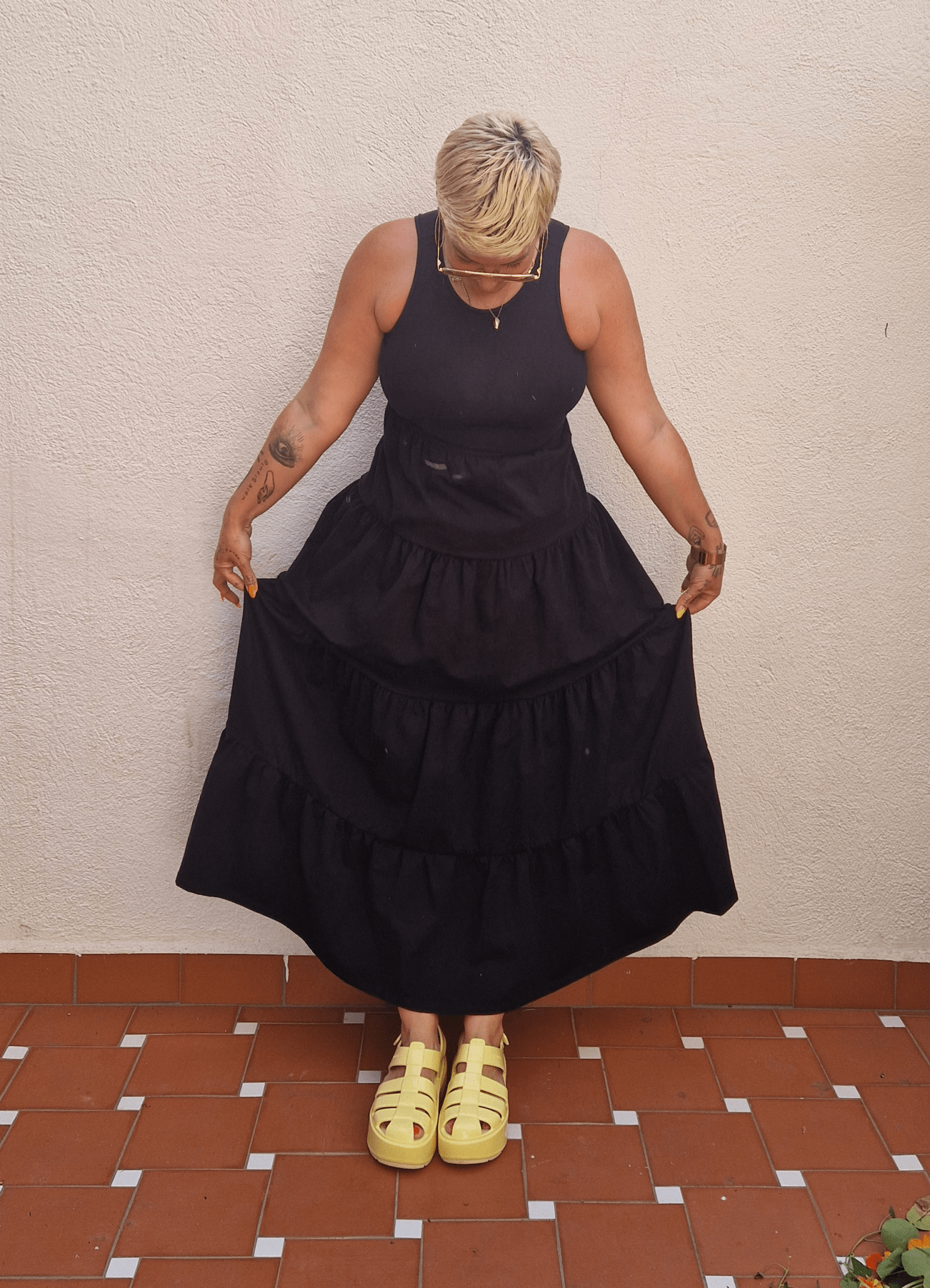 The NEW TUYA MAXI DRESS! It's a tiered cup-cake of a dress. Made to support your tits but flow loosely over the rest of your glorious body! With a cute little button back and no sleeves for extra summer coooool.