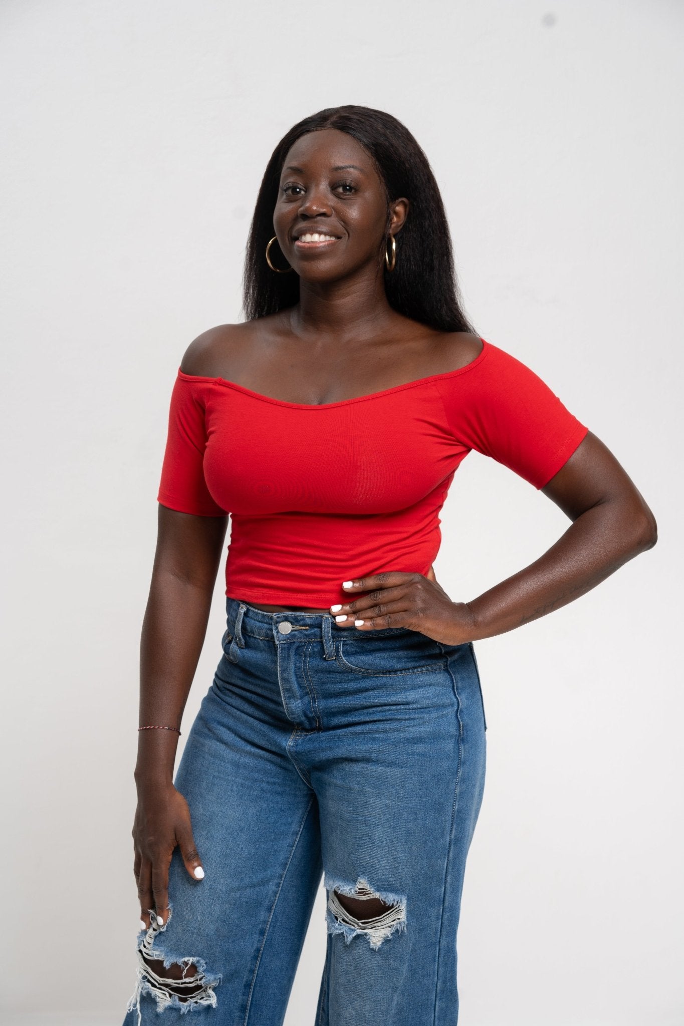 Bardot Short Sleeve Mid Crop Top in Pomegranate Red