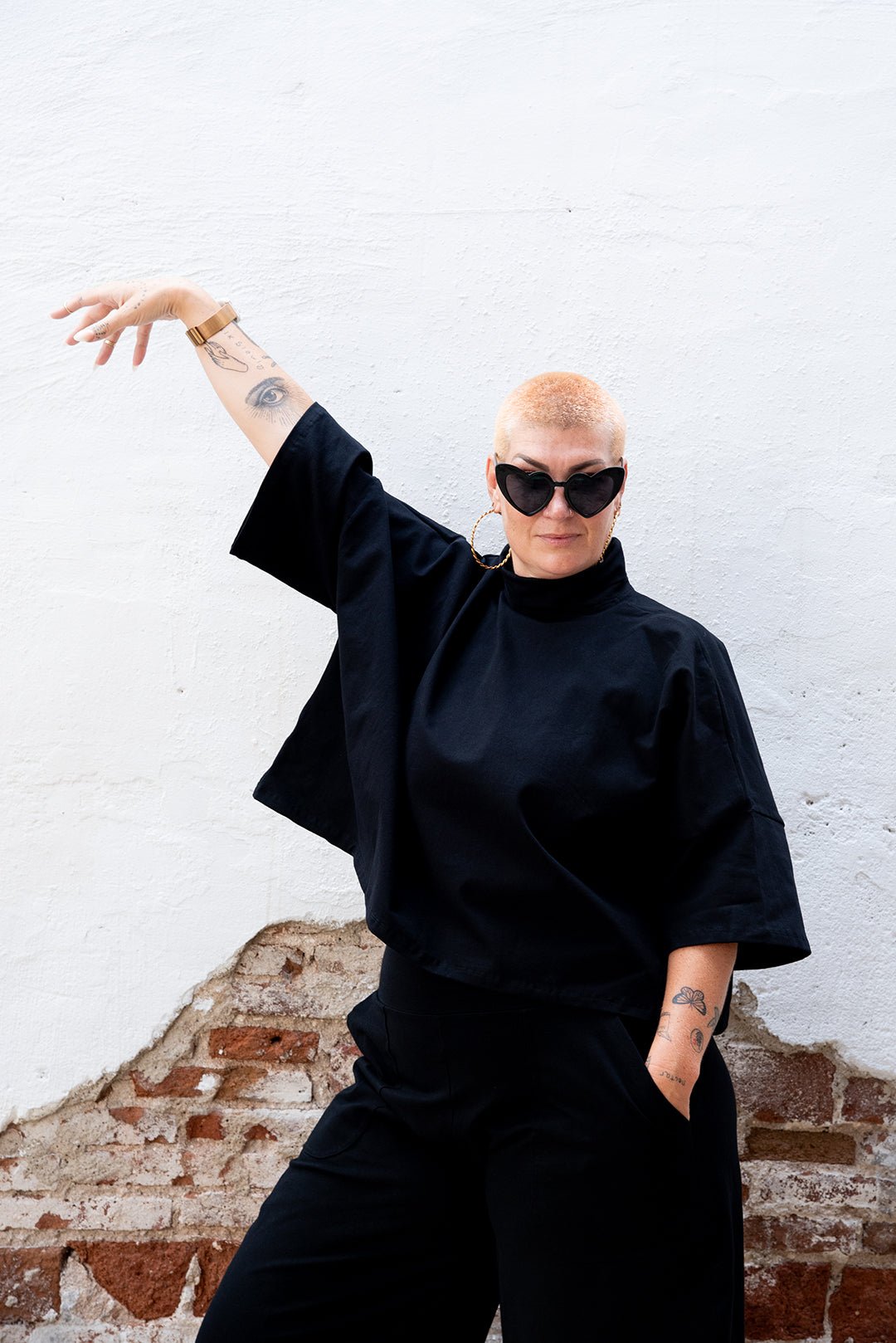 • Funnel Neck Oversized Crop Tee in Black - Manners London