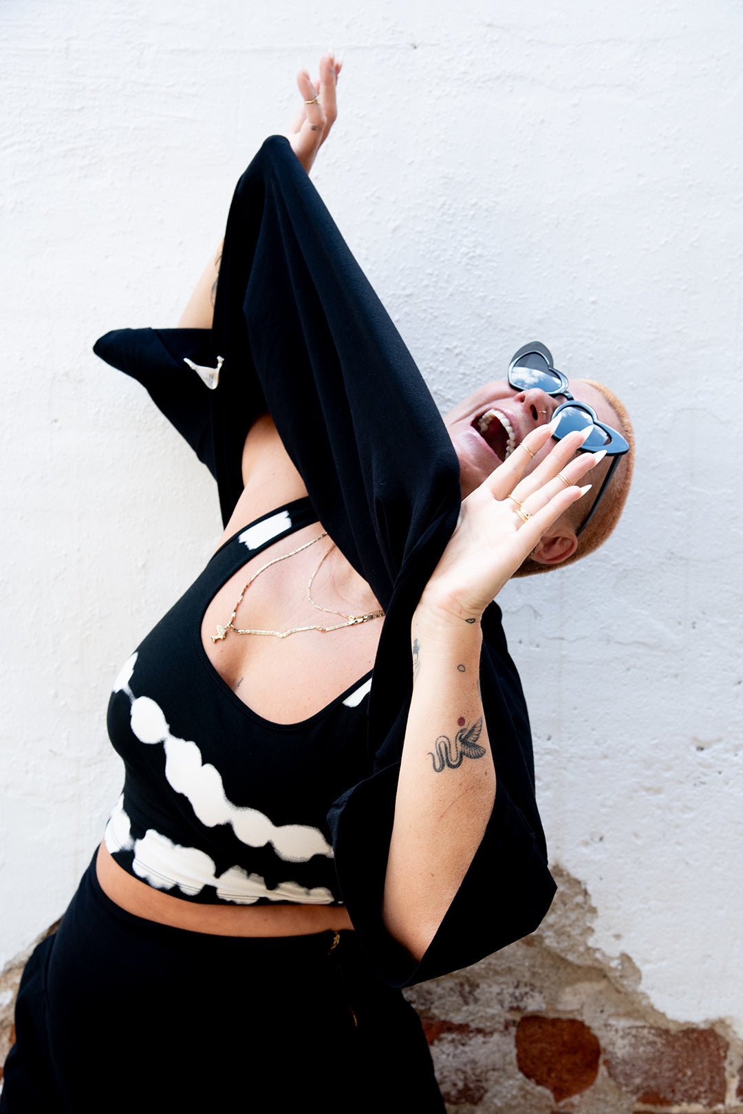 Every piece is made from the thickest dreamiest-creamiest-smoothiest stretch fabric. To be stretched and pulled and washed at the wrong heat and left on the line too long, screwed up in bags with muddy boots and danced all night in and still be your favourite piece of clothing every time. Because we know life is messy so you need clothes as strong as you.
