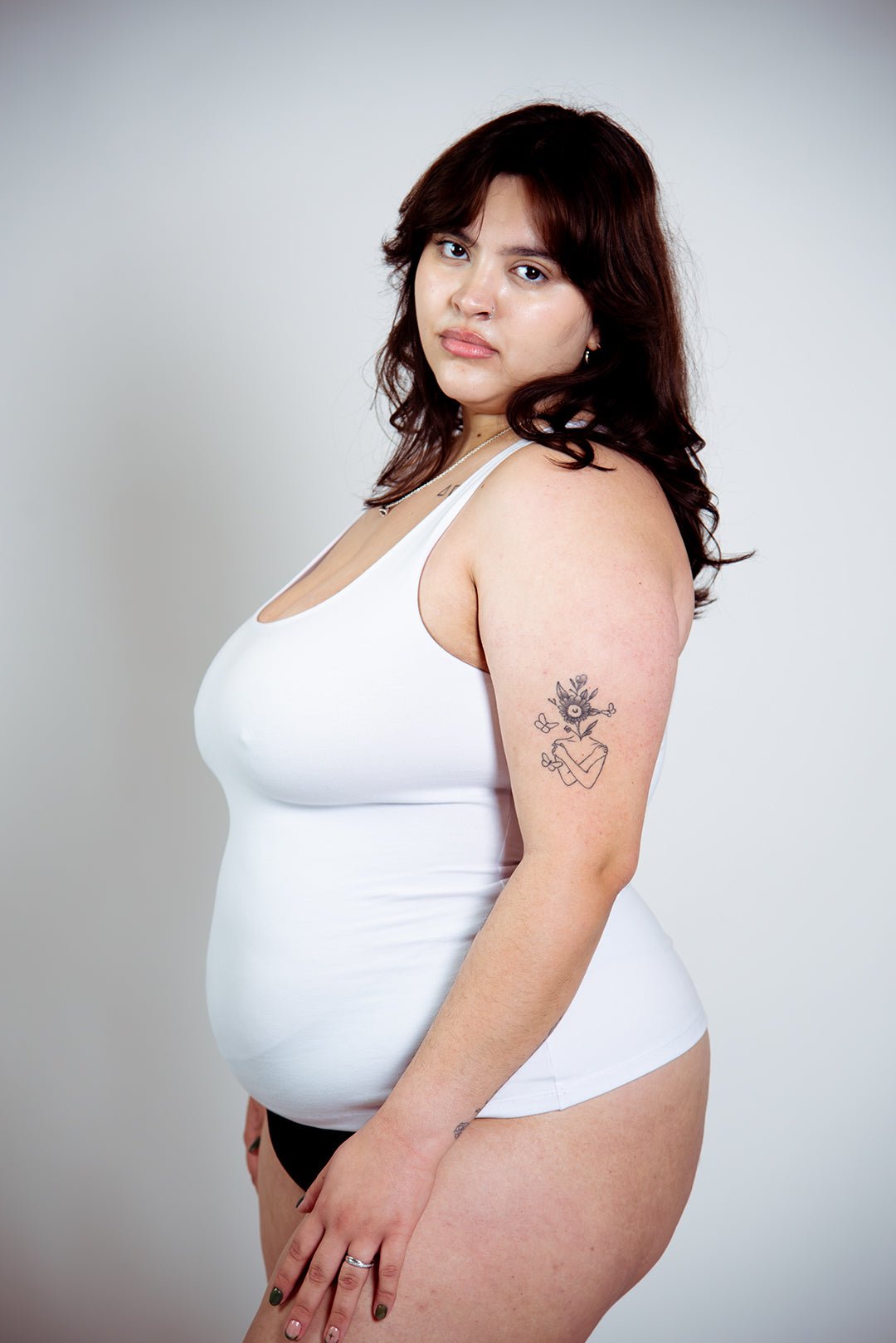 The fabric used for all Manners London pieces is super thick heavyweight stretch cotton made of 90% cotton 10% elastane. It has a huge stretch allowance without going see-through at all! On arrival items will look small but don't be scared, it's just the nature of the fabric and what makes it so deliciously smoothing and shaping and magical!